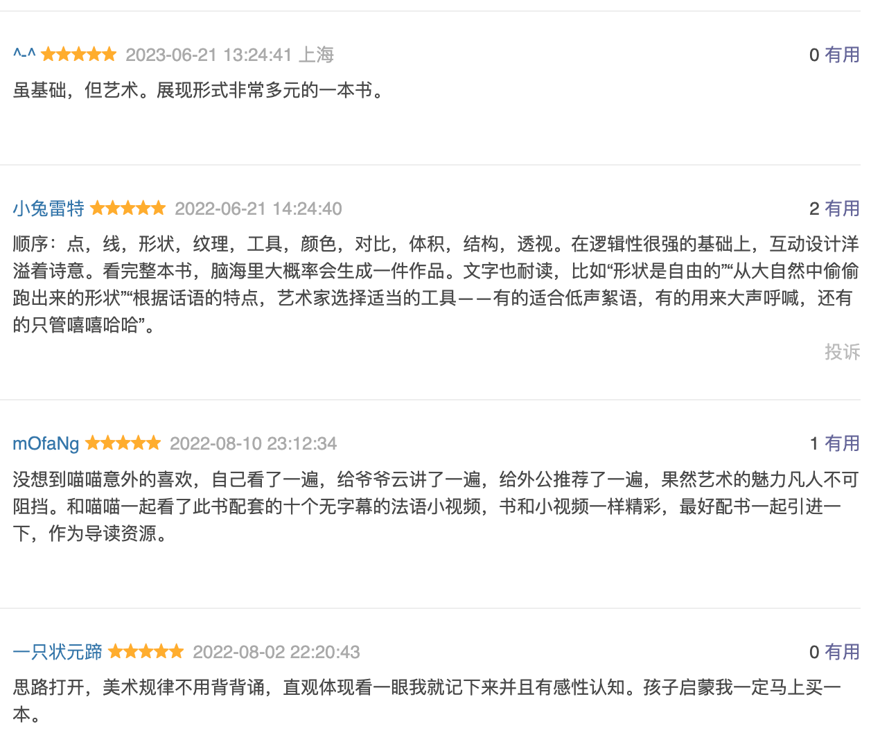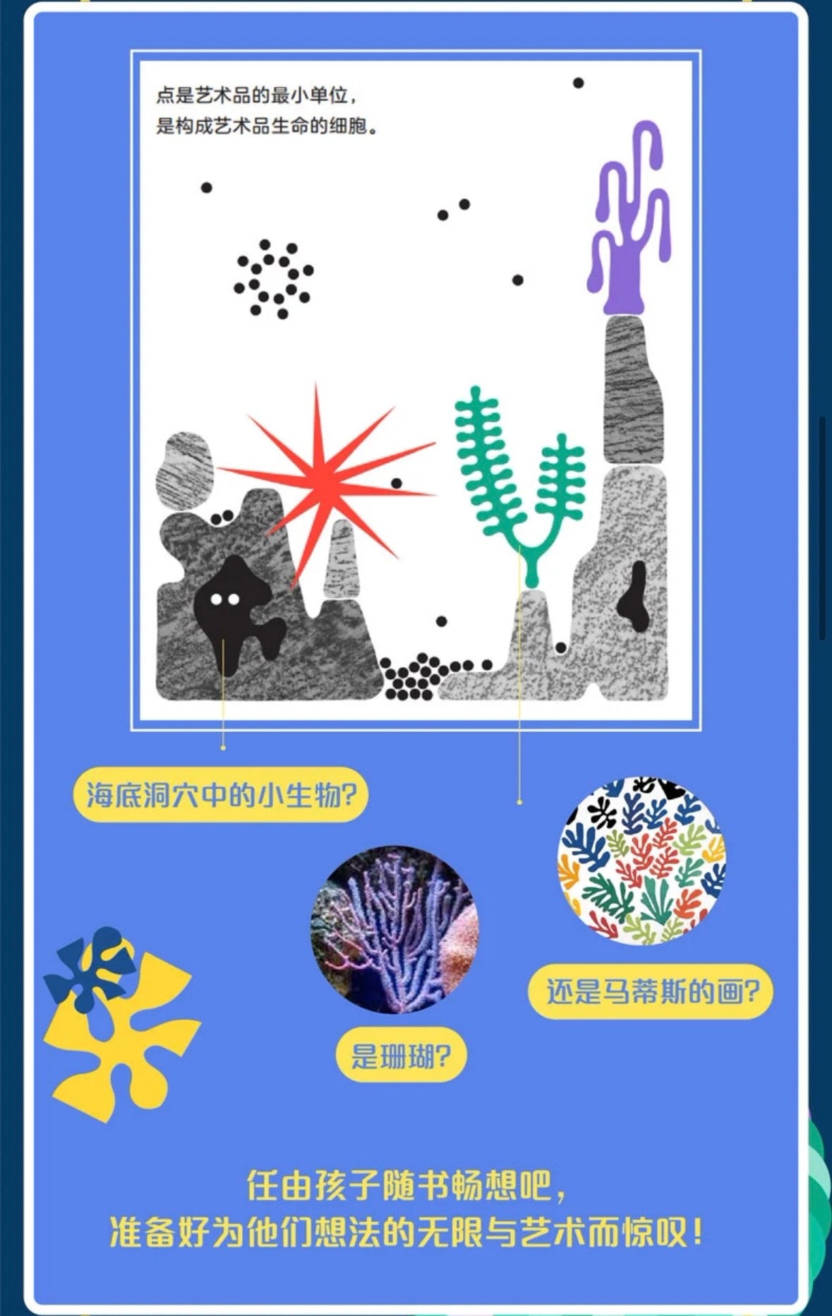本书被法国媒体盛赞为“本身就是一件艺术品”,每张图颜色饱满、线条灵动、构图精巧,单独展出都是一幅具有强烈吸引力的现代派画作。文字饱含诗意、富有哲理,阐述的既是艺术元素与原理,又能延展到文学、音乐、建筑等大艺术领域。文图间为读者留下了无限畅想的空间,每一页都能引出不同问题、不同理解,适合亲子共读。孩子与大人一起捧着书、围绕艺术谈天说地的画面,也许是对“美育”的一个理想注解。